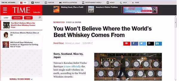 然而实际上,他们解决问题的速度,快得让人措手不及——2015年,Kavalan的经典独奏Vinho葡萄酒桶威士忌,斩获了当年的WWA世界威士忌竞赛的“世界最佳单一麦芽威士忌”奖项。把大部分业内人和消费者的下巴都惊掉了。 尤其像主页君这样被早期的Kavalan初代产品吓到过的,那感觉就像小学时成绩还全班垫底的狗蛋,突然考了个高考状元进了北大。 连美国《时代杂志》都报道了这一事件,并配以这样的标题:你不会相信世界最佳威士忌来自哪里。