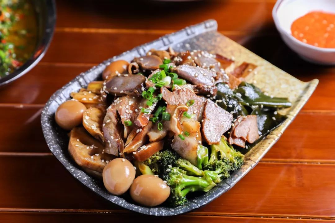 店家秘制卤味拼盘,用簸箕装着上桌,非常吸睛!鹌鹑蛋、鸭肫、猪耳...足足10+种料,这样一份就能全部吃到!