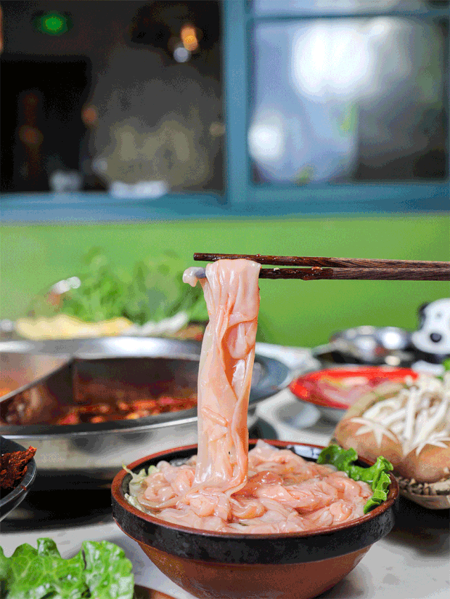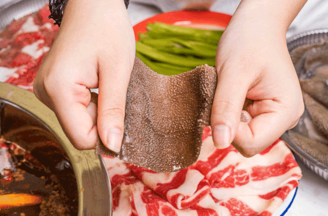 火锅伴侣毛肚怎么可以错过!从成都空运而来的脆毛肚,用筷子随便拎起来一片,简直比脸还要大。