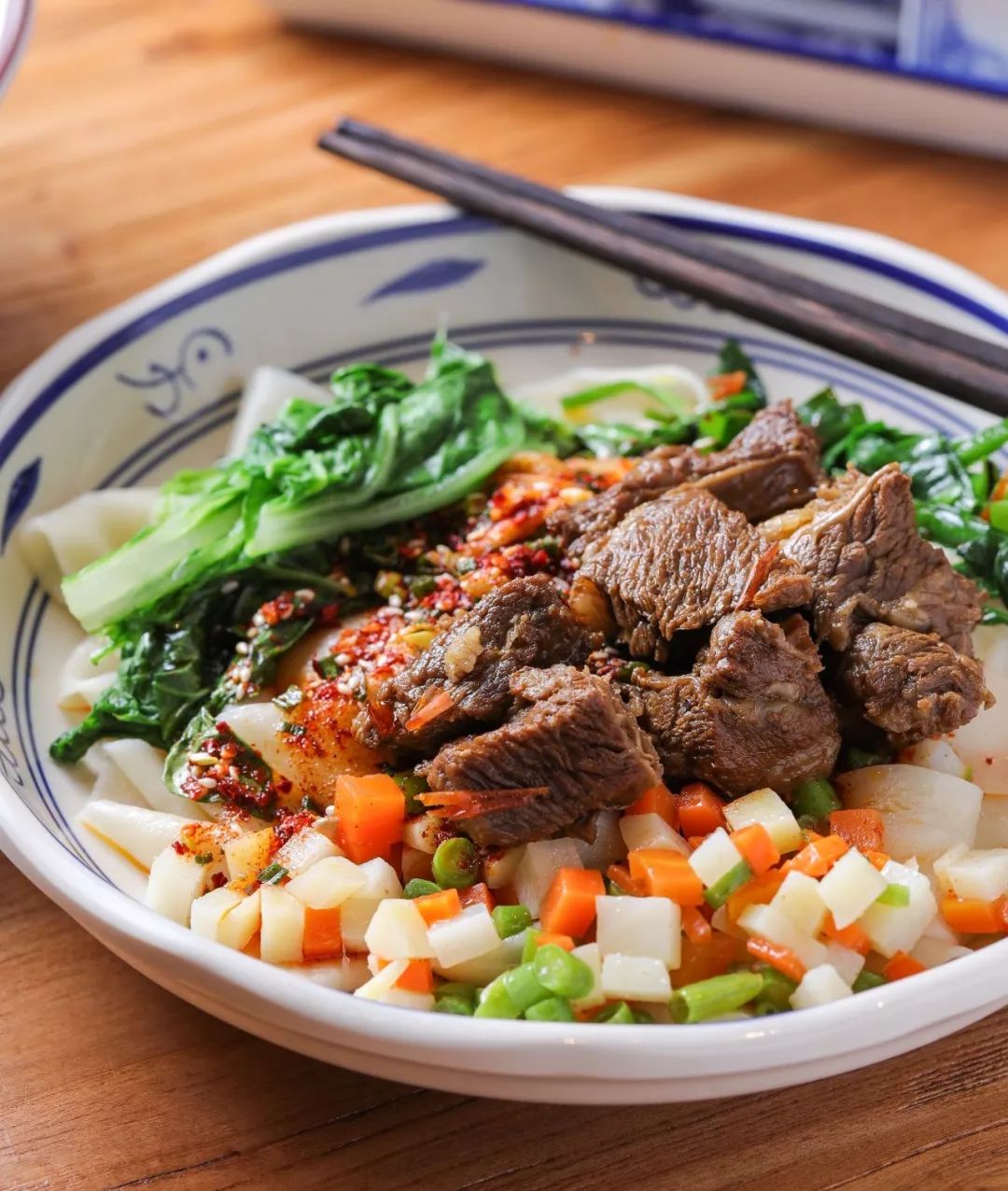 店内的拌面也十分受欢迎,新鲜蔬菜和牛肉满满的铺在面上,看着就食欲满满。ps:拌面端上来之后,要尽快食用哦~