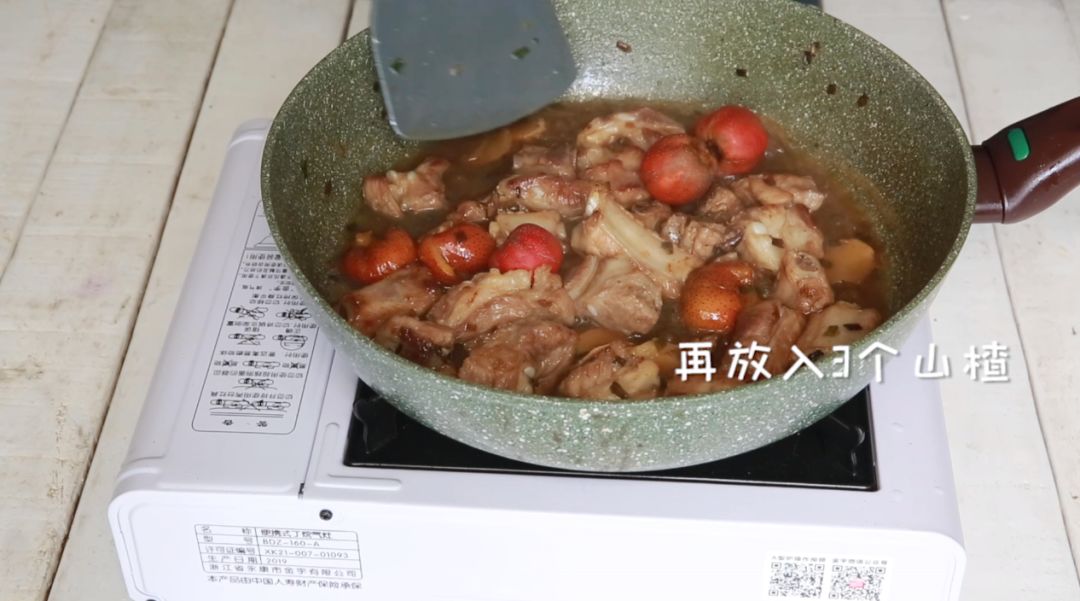 时间到后,再放入3个山楂翻炒均匀,接着转小火,等汤汁变得浓稠后山楂小排就完成啦!