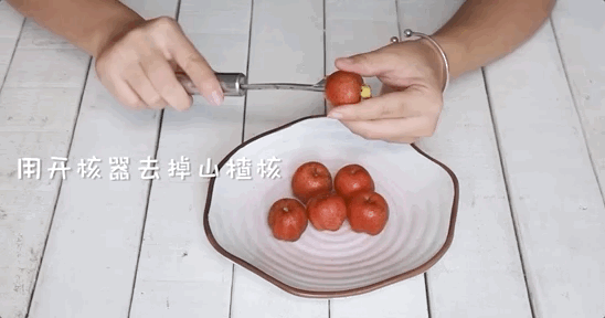 ▼ 1. 山楂去核:用开核器缓缓钻进山楂中央,把山楂核捅出来。