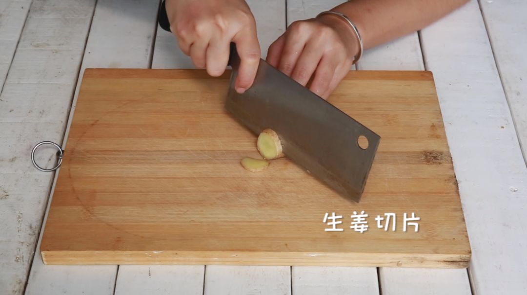 ▼ 2. 焯煮猪肋排:把姜块切片。