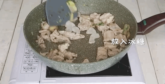 中火炒至猪肋排表面略微变色后,放入冰糖。