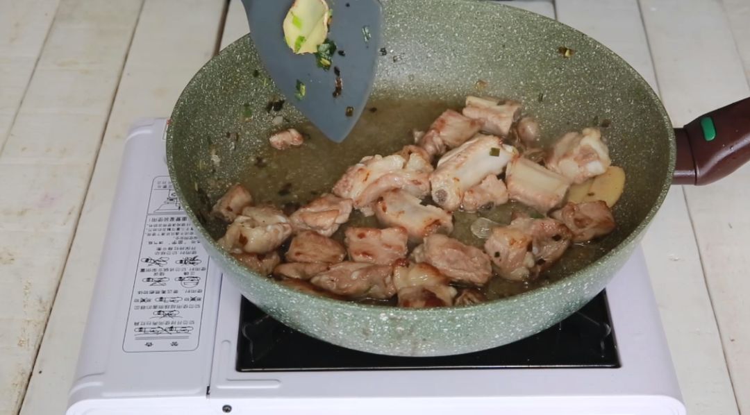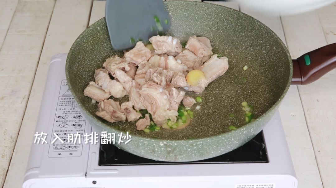 热锅冷油放入切好的葱、姜。炒出香味后,放入煮好的猪肋排。
