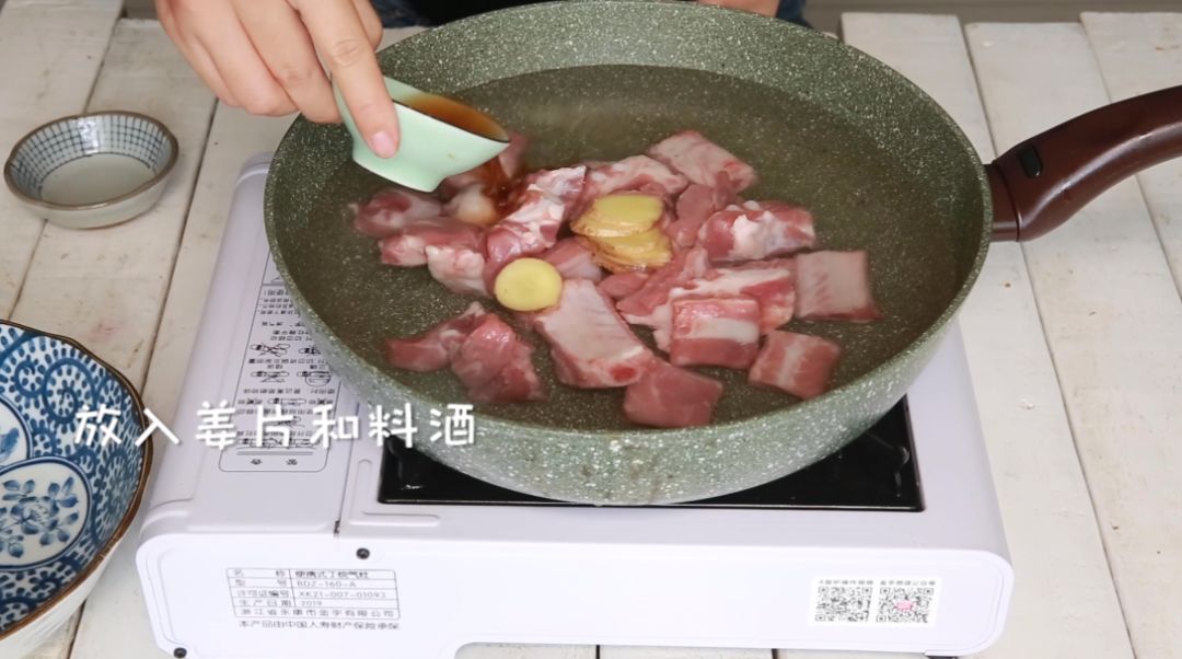 冷水里放入猪肋排、姜片和1瓷勺料酒。